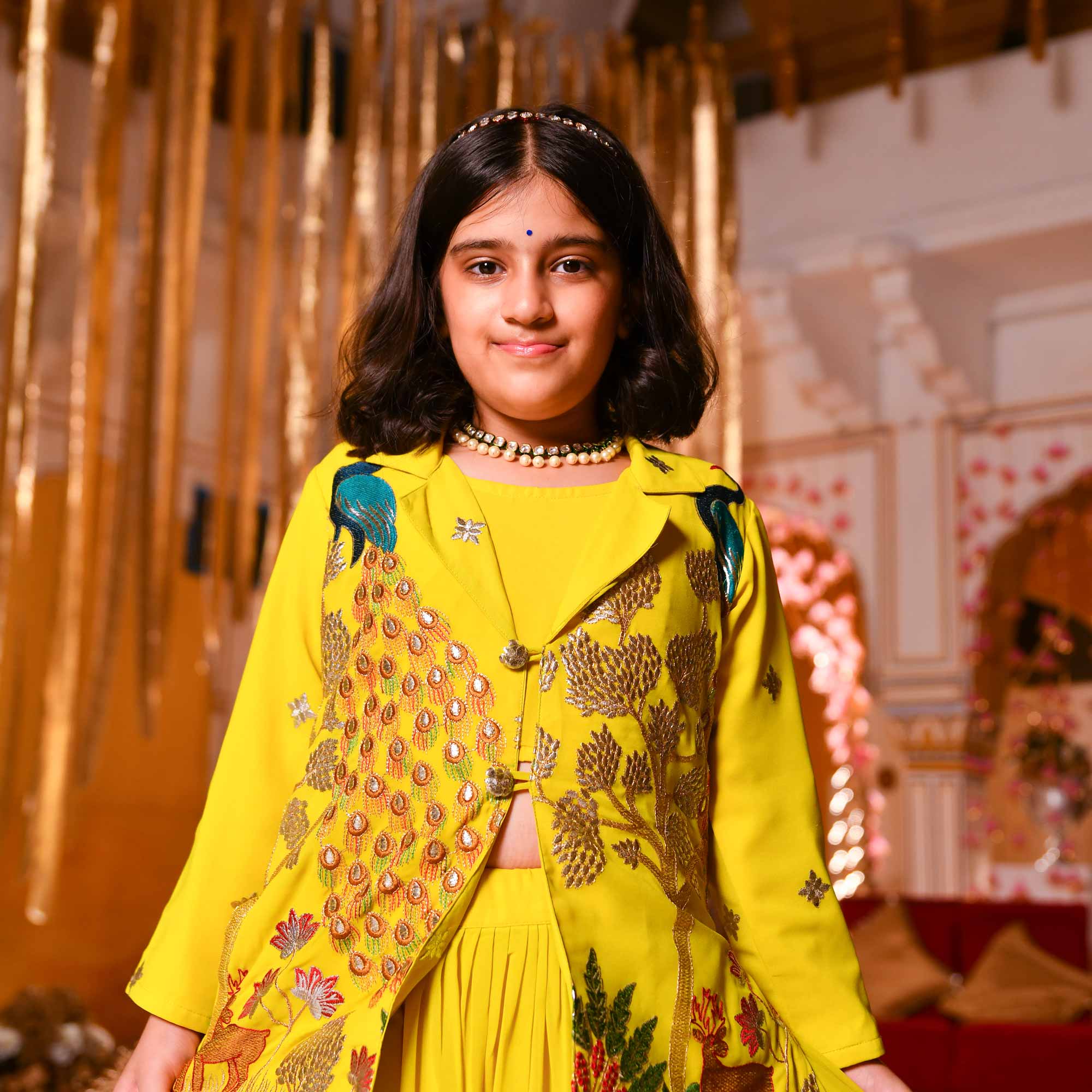 - Dress your little one in pure elegance with "Golden Feather Kids Georgette Blazer Lehenga Set".