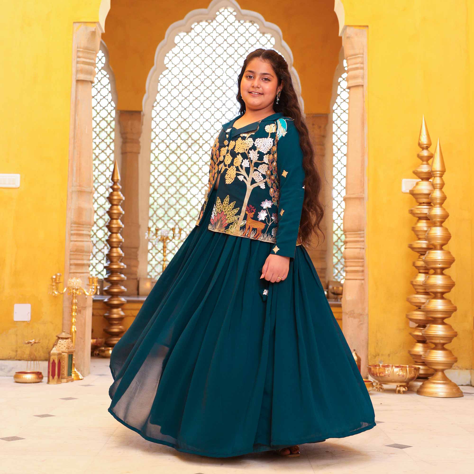 - Dress your little one in pure elegance with "The Mor Mahal - Peacock Blue Kids Georgette Blazer Lehenga Set".