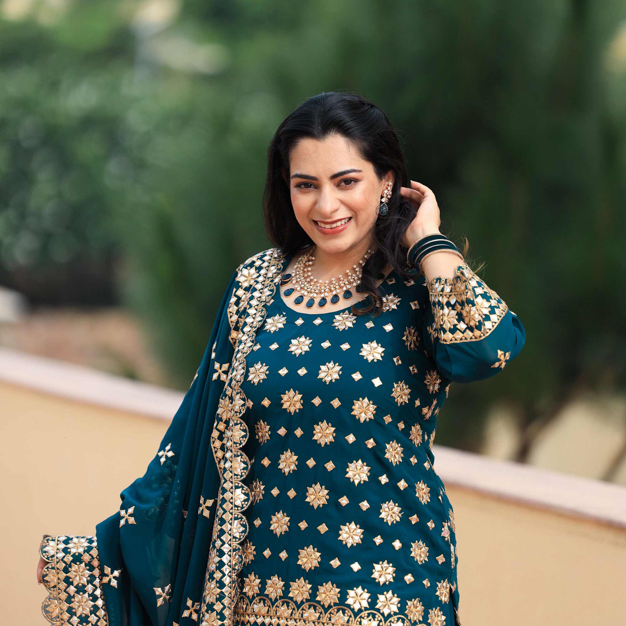 - Presenting the new "Peacock Blue Gota Patti Georgette Lehenga Set" to captivate the surroundings.