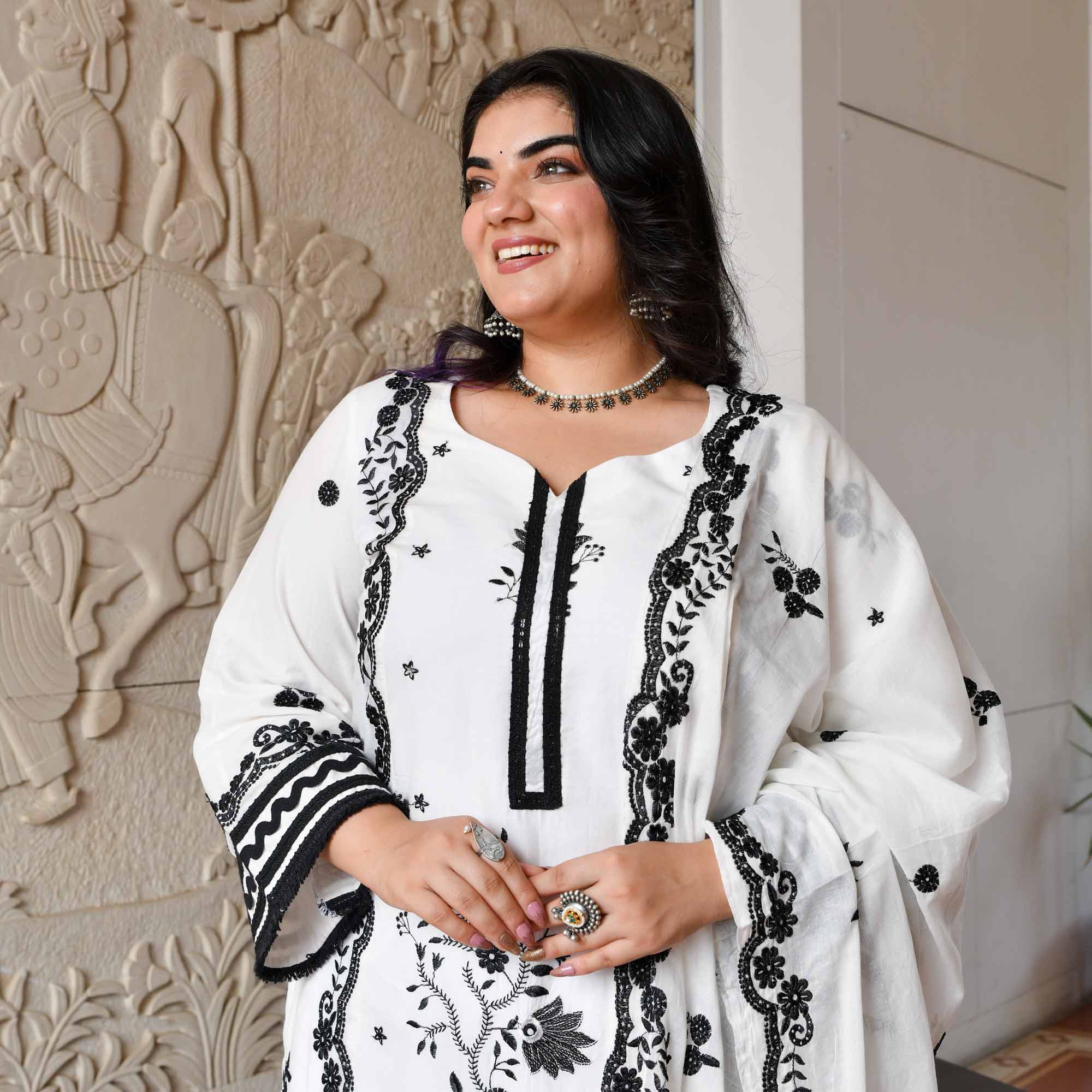 - Strikingly elegant, "Tara – White & Black Pure Cotton Thread Embroidered Suit Set" blends classic contrast with intricate craftsmanship.