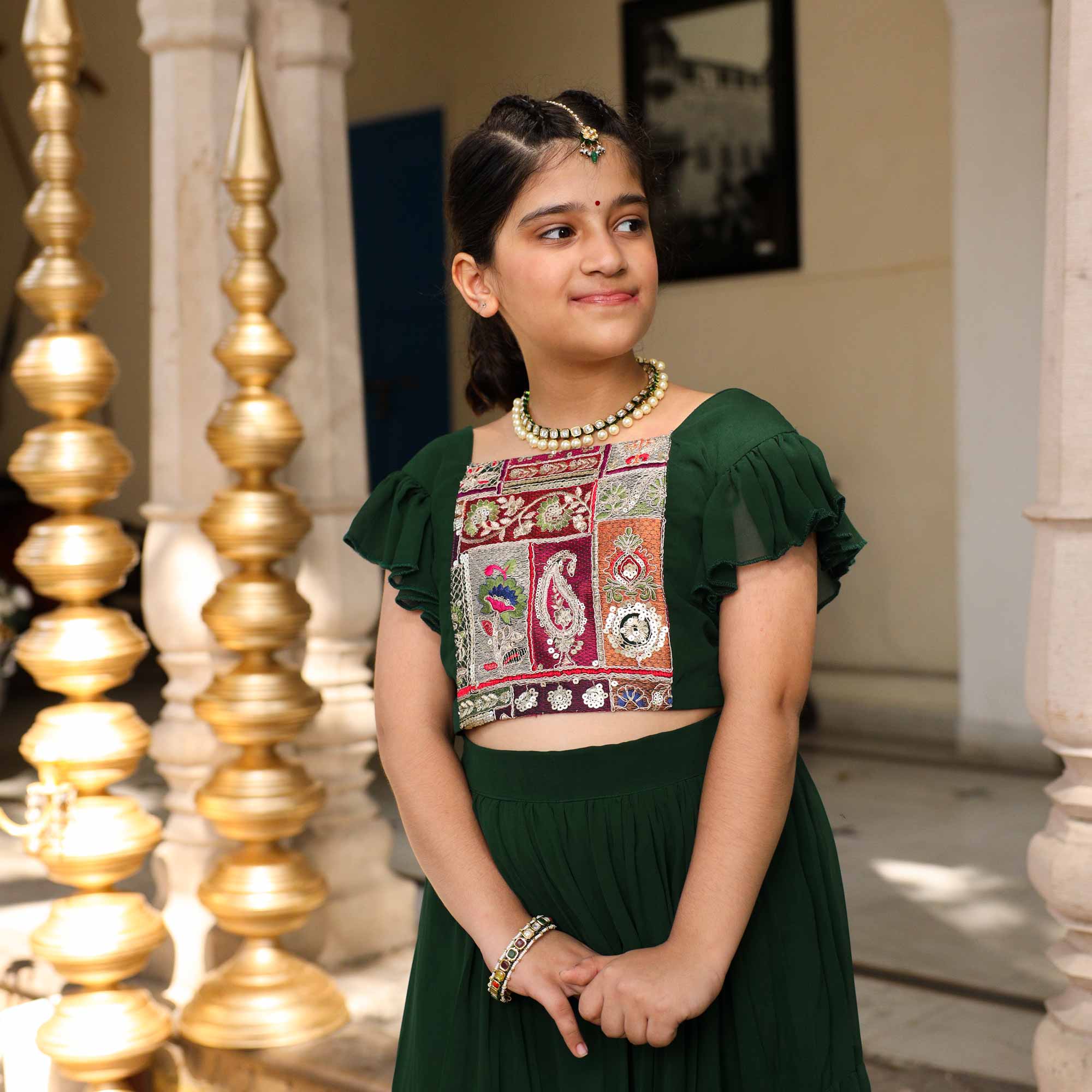 - Let your little star twirl and shine in "The Twinkle In Green Kids Georgette Embroidered Lehenga Set".