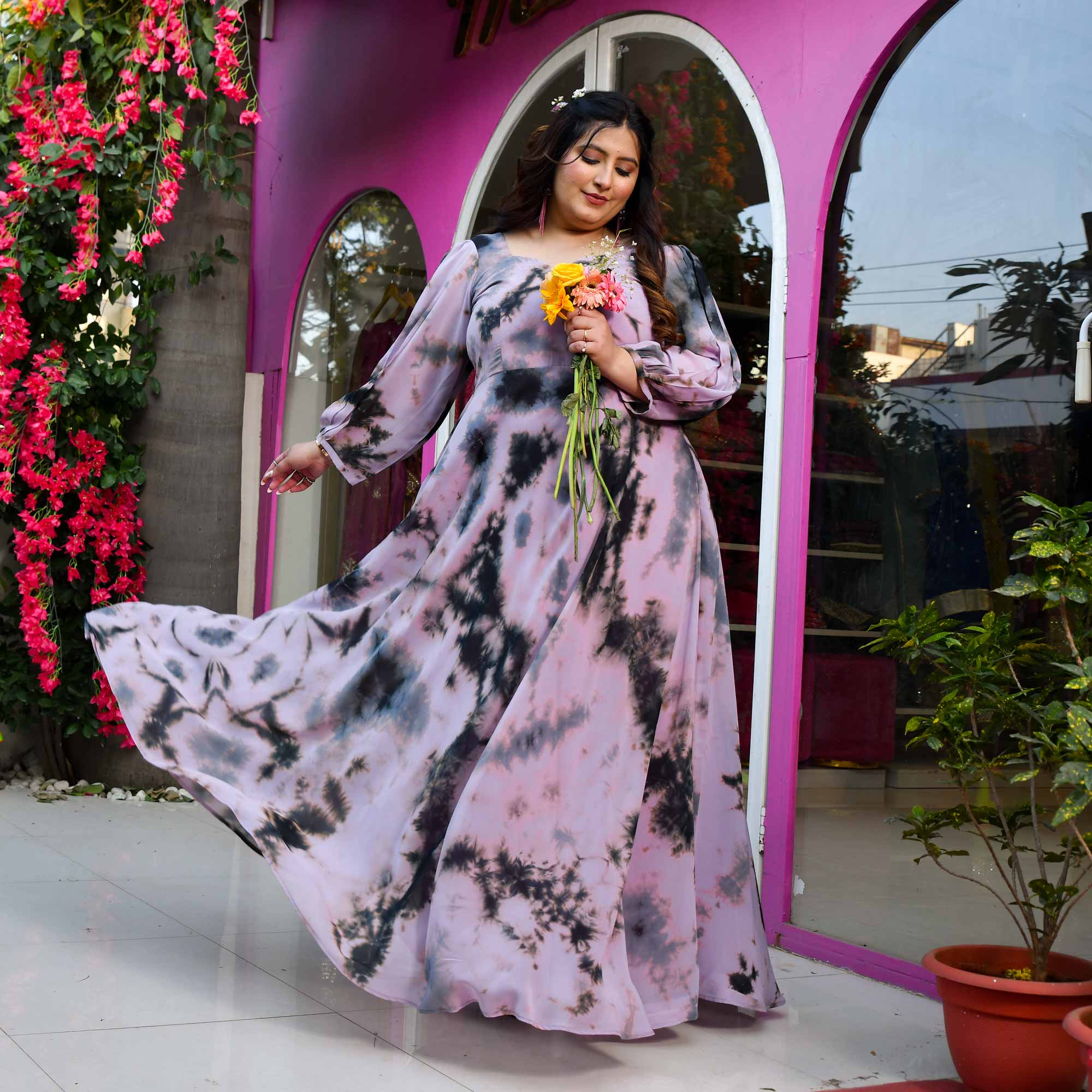 - A mesmerizing blend of elegance and fluidity, this dress is designed in dusky pink & grey tie-dye georgette. It features a sweetheart neckline, voluminous flare, and gathered sleeves, creating a silhouette that moves like a dream. A true statement of grace, this dress is perfect for twirls, romance, and unforgettable moments!Â